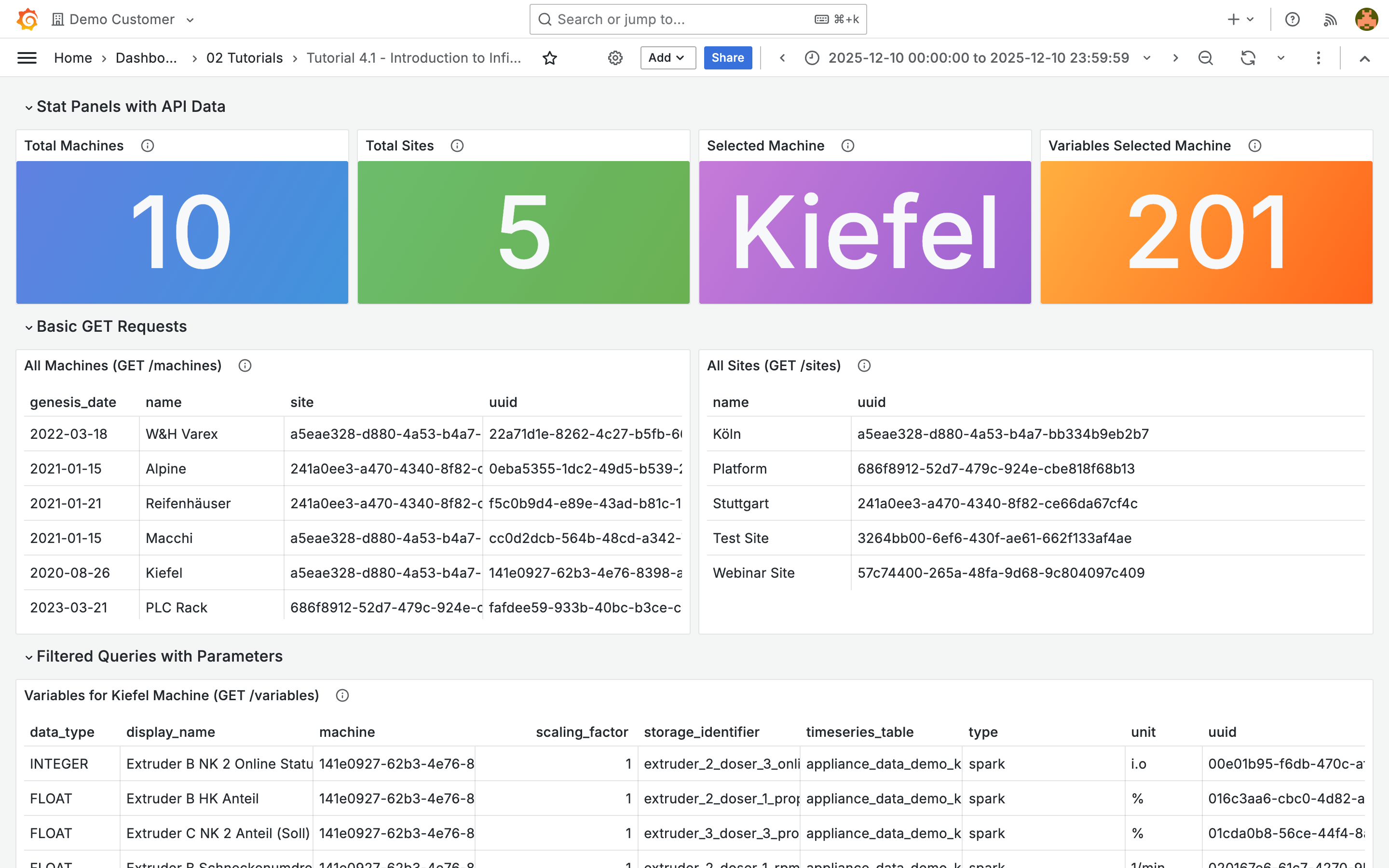 This section covers advanced dashboard development using the ENLYZE API data source (powered by the Infinity plugin). You'll learn to query API endpoints directly for production data, OEE metrics, downtimes, and more.