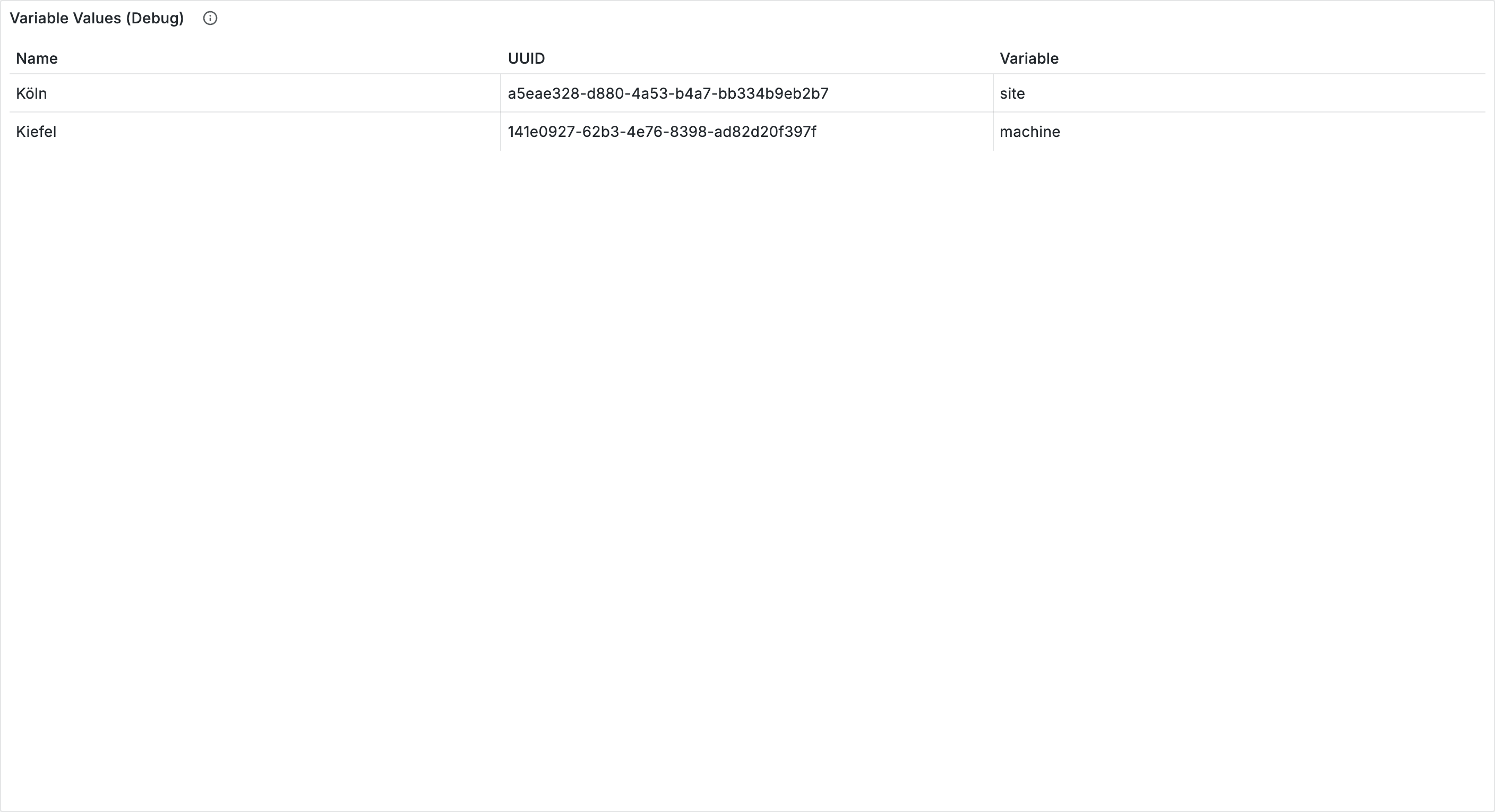 The table shows you exactly which values Grafana substitutes. This is particularly helpful when a query does not return the expected result and you want to check whether the correct UUID is being passed.