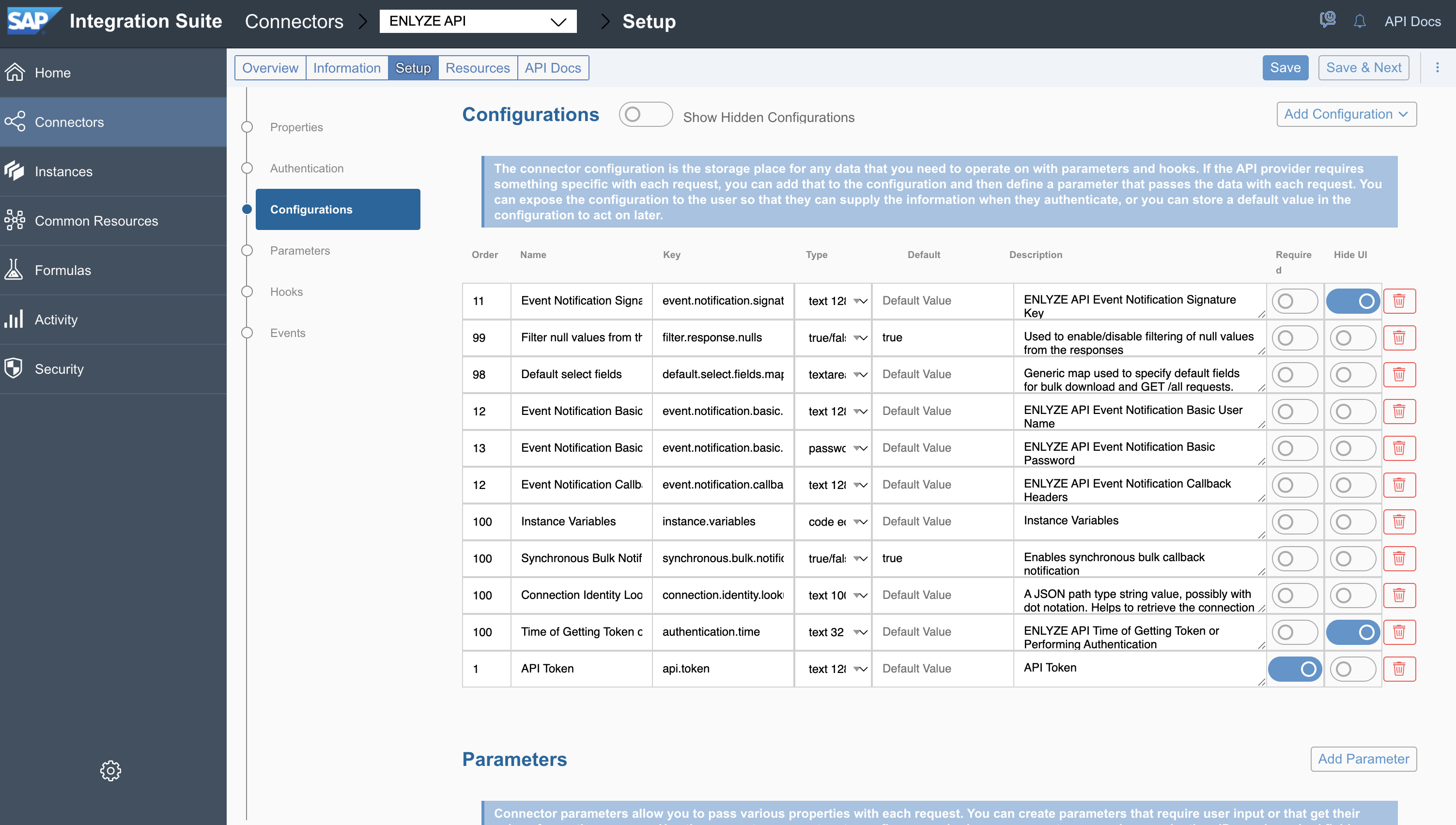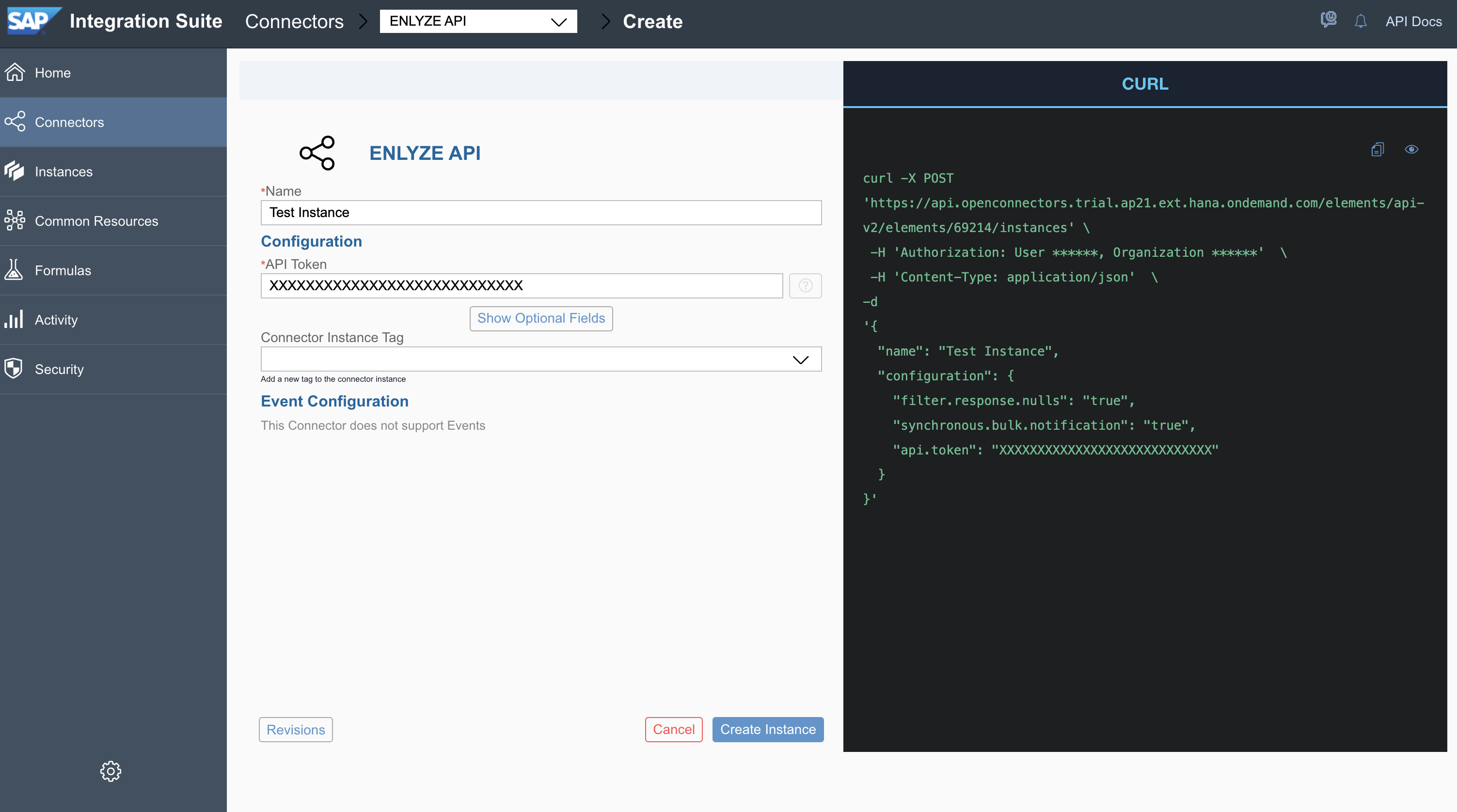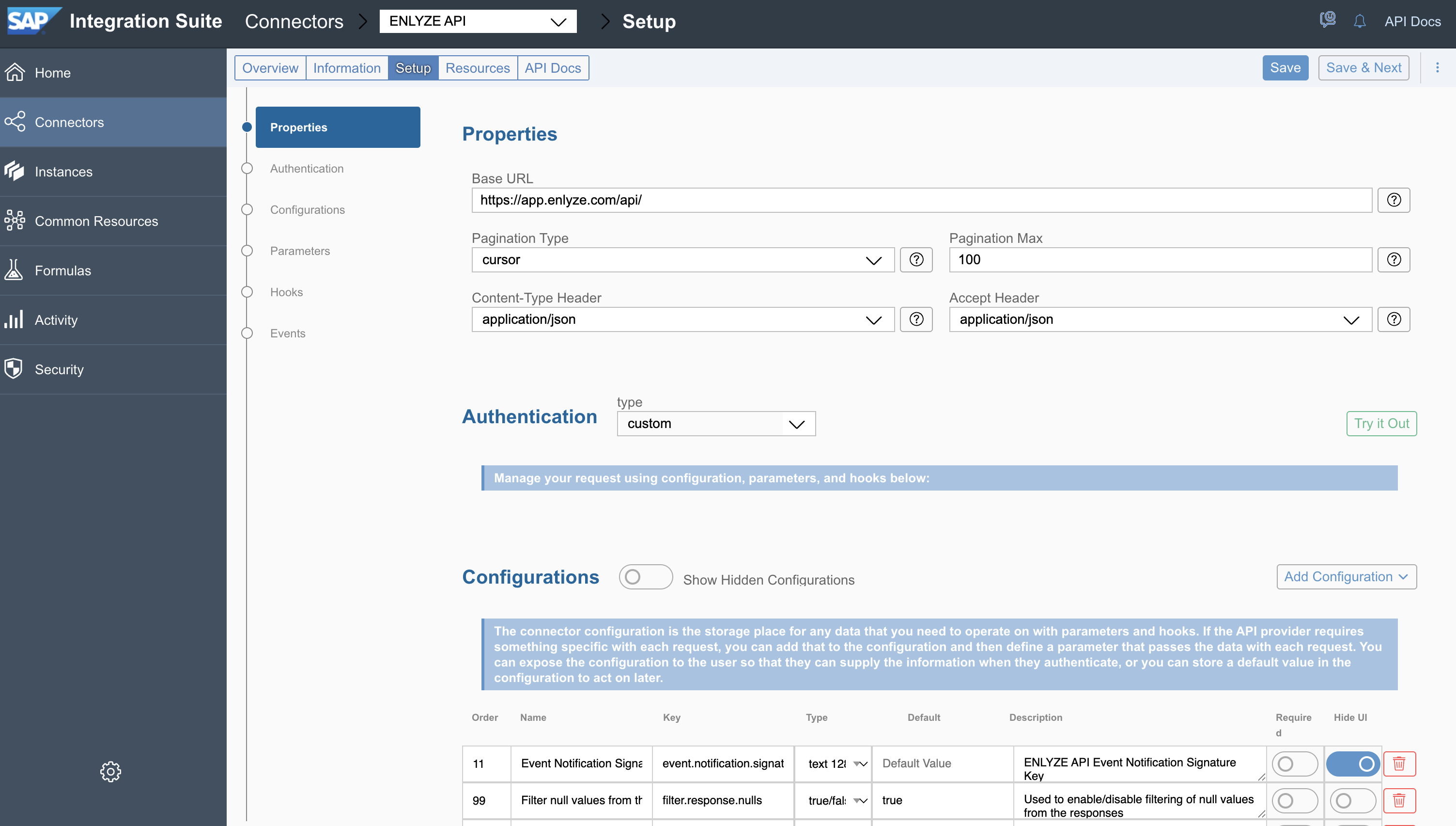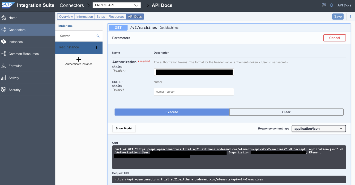 Build and test a Custom connector in SAP Integration Suite → Open Connectors for the ENLYZE REST API, using an API Token and a PreRequest Hook to inject the upstream Authorization: Bearer <token> header. Then verify calls in API Docs and (optionally) wire the instance into a Cloud Integration iFlow.