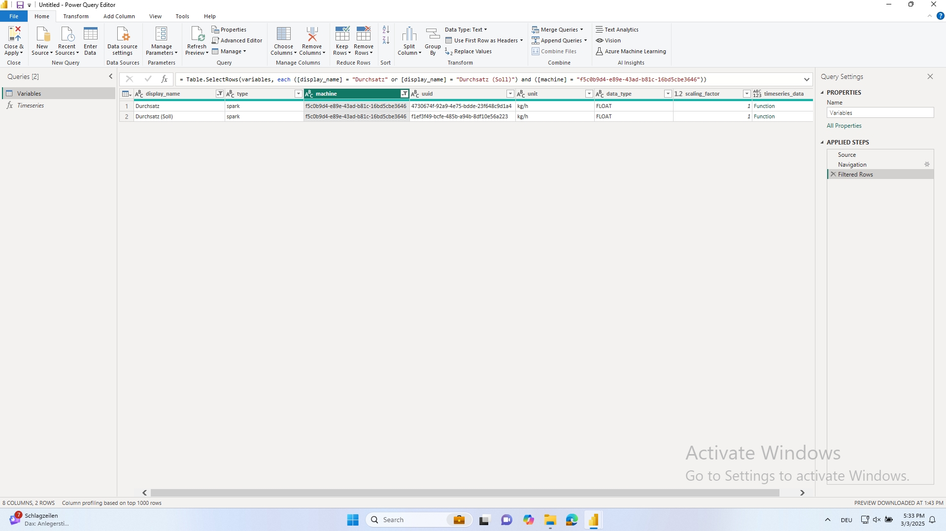Variablesand the functionTimeseries.Click Transform Data to open the Power Query Editor.