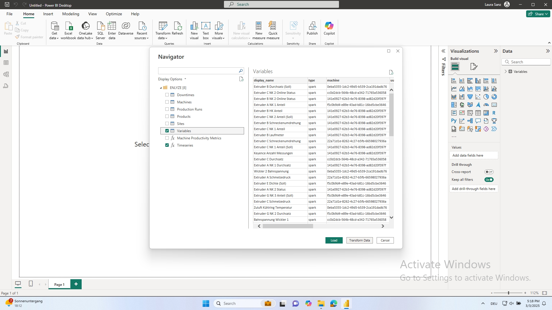 The ENLYZE Power BI Integration allows querying machine data for a defined time period. This data originates from machine variables and follows a time series format, meaning there is one data point per time interval.