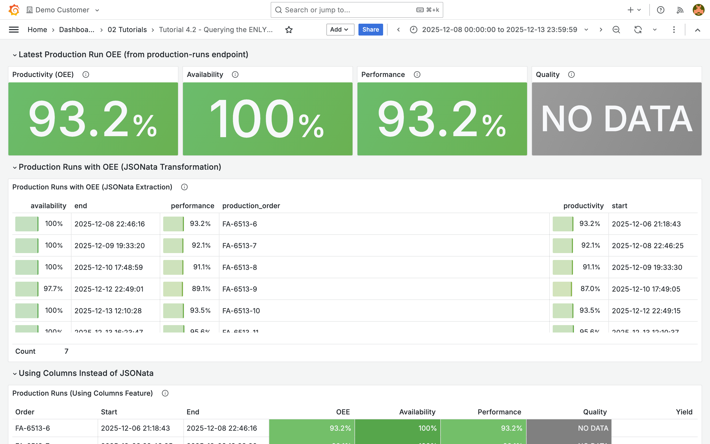 In diesem Abschnitt geht es um die fortgeschrittene Dashboard-Entwicklung mit der ENLYZE API Data Source (basierend auf dem Infinity Plugin). Du lernst, API-Endpunkte direkt abzufragen, um Produktionsdaten, OEE-Kennzahlen, Stillstände und mehr zu visualisieren.