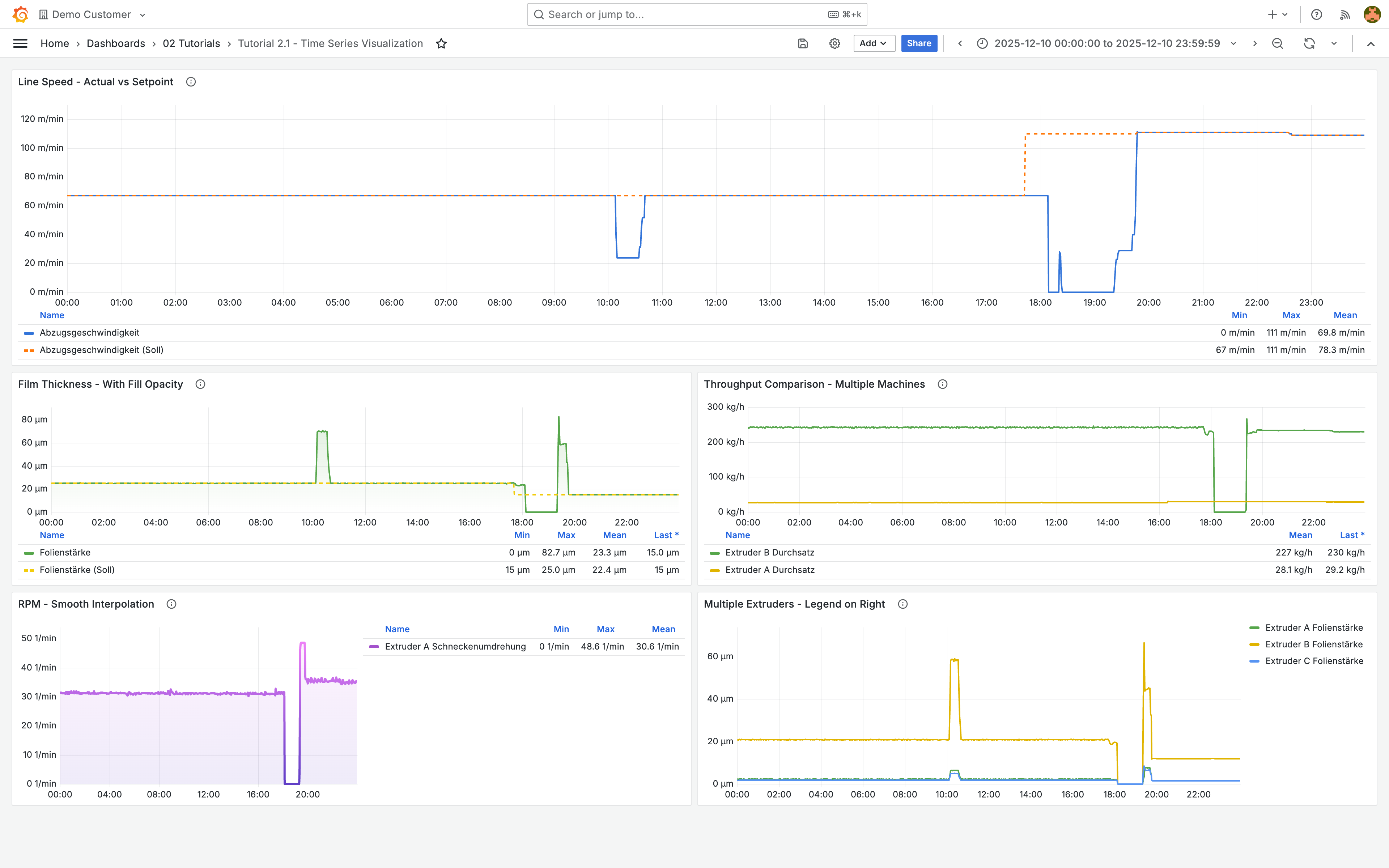 Zeitreihendiagramme sind die häufigste Visualisierung in Fertigungs-Dashboards. Sie zeigen, wie sich Prozessparameter wie Temperatur, Druck und Geschwindigkeit über die Zeit verändern. In diesem Tutorial baust du Schritt für Schritt ein Dashboard wie dieses: