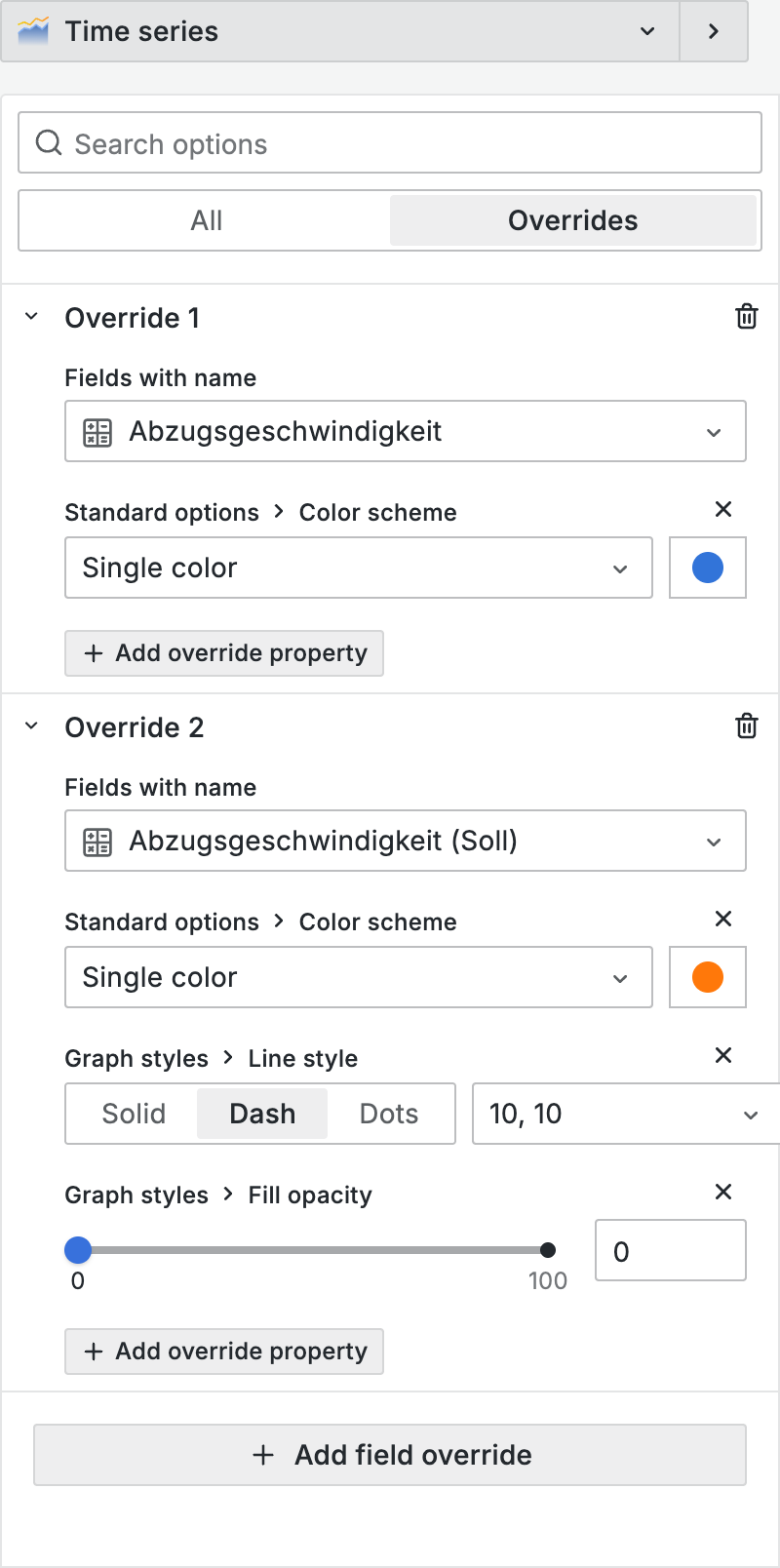 Field Overrides ermöglichen es, unterschiedliche Einstellungen auf bestimmte Datenreihen innerhalb eines Panels anzuwenden.